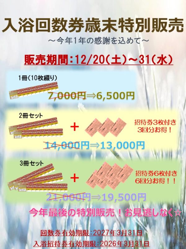 入浴回数券歳末特売!まとめ買いで招待券プレゼント🎁